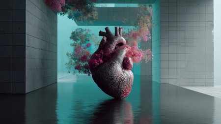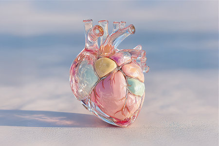 A dreamy, artistic glass heart filled with pastel petals, soft floral textures, and glowing translucent anatomy. Gentle veins, delicate blossoms, and blend into human life.