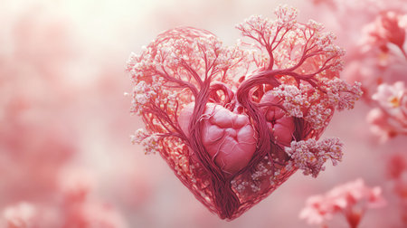 Heart made of vascular branches and flowers, pastel background, conceptual health art, centered