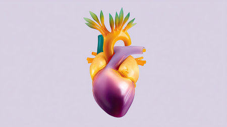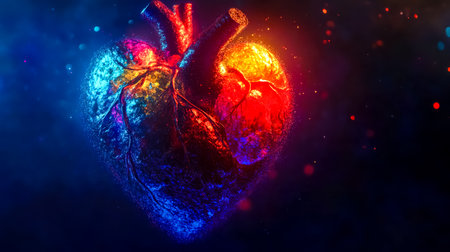 This vividly portrayal showcases a human heart glowing with dynamic colors. The heart appears lifelike, radiating a warm light in a dark setting, emphasizing its intricate details.