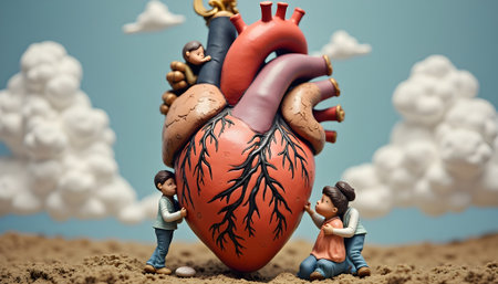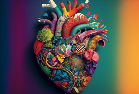 A vibrant heart model surrounded by colorful floating shapes and hearts, symbolizing love and emotion, perfect for health and creative projects.