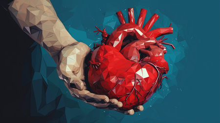 Red color heart with stylish design, holding it with two hands. Symbolizes love, care and connection. A unique and attractive visual representation of emotions.