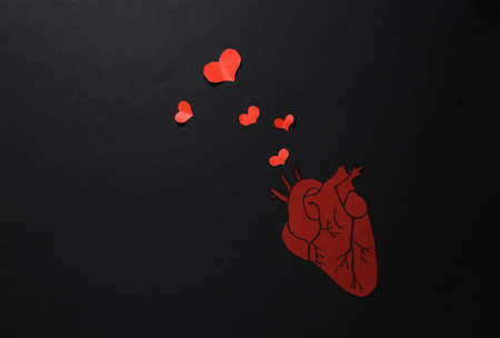 love concept. Anatomical heart and love hearts on black background. Valentine's Day. 14th February