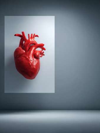 A realistic heart model shows healthy heart function with a clean design in a minimal healthcare scene.