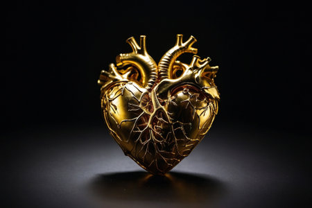 Realistic human heart anatomy model with detailed textures and vibrant color against a dark background for educational and medical purposes