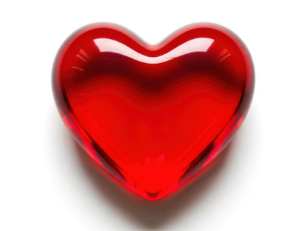 A bright red heart is centered on a clean white background. The heart displays a smooth, solid texture, rendered in a simple graphic style. Overhead lighting creates minimal shadows. This image is suitable for various projects related to romance, relationships, or expressing feelings, and is suitable for commercial uses.
