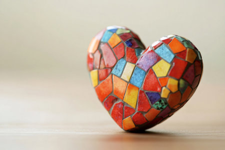 Vibrant mosaic heart resting on a wooden surface, symbolizing love, art, and skilled craftsmanship with its colorful design and intricate details