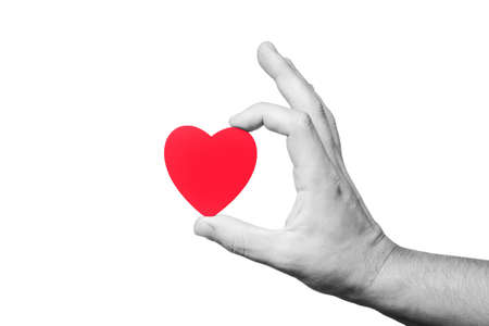 Black and white photo with red heart. Hand holding heart shape on a stick. Love symbol background. God have mercy on us. The hope for better.
