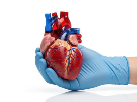 This image features a detailed model of a human heart, showcasing its anatomical structure. The heart model is held by a gloved hand and is set against a white background. The image is clear and SEO-friendly, highlighting the heart's intricate details.
