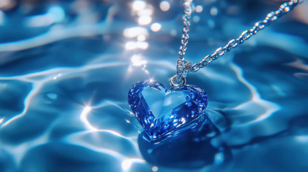 This artistic image features a heart-shaped blue gem necklace elegantly resting on a shimmering water surface, creating a tranquil and romantic atmosphere.