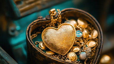 A beautifully crafted heart-shaped gold locket rests among a collection of vintage jewelry, evoking feelings of nostalgia and luxury. Perfect for storytelling.