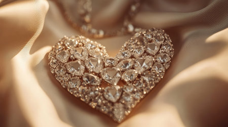 A stunning heart-shaped pendant adorned with sparkling gemstones rests on luxurious satin fabric, capturing light and elegance. Perfect for gifts or occasions.