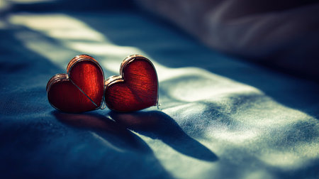 Two Beautifully Connected Red Hearts Gently Resting on a Shiny and Reflective Surface