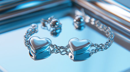 Discover a stunning silver heart jewelry set featuring a bracelet and matching earrings. Displayed elegantly on a reflective surface, this stylish set embodies love and sophistication.