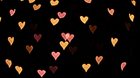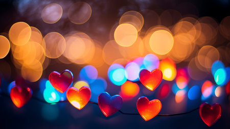 Blurred heart shape bokeh lights creating a colorful, soft, and romantic background
