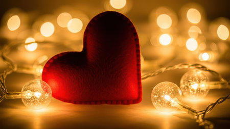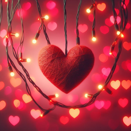 A close-up image of a red heart-shaped decoration surrounded by warm, glowing string lights. The heart is the central focus, with the lights creating a soft, ambient atmosphere around it. The background is blurred, emphasizing the heart and lights.