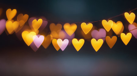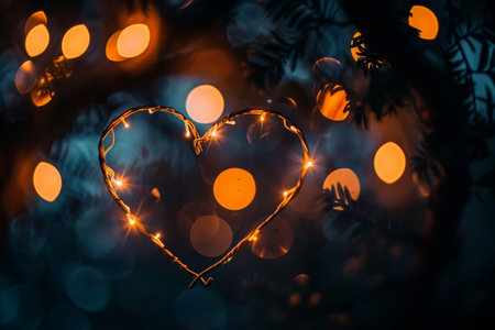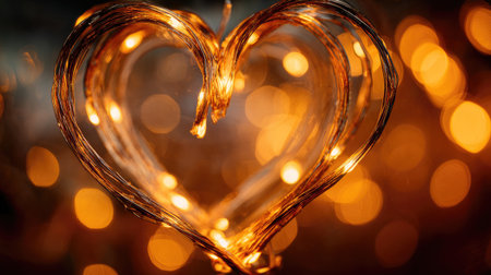 A heart-shaped arrangement of warm, glowing string lights set against a soft bokeh background creates a romantic and cozy atmosphere perfect for celebrations.