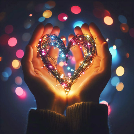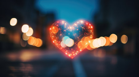A heart shape formed by fairy lights glows against a background of bokeh lights. Clear details and vibrant col...
