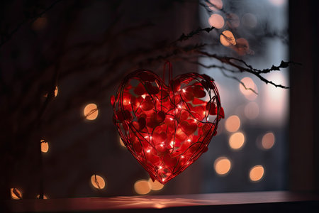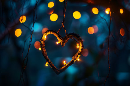 A heart-shaped light glowing against a dark backdrop, hanging from a tree branch, Glowing lights illuminating a heart silhouette against a dark background