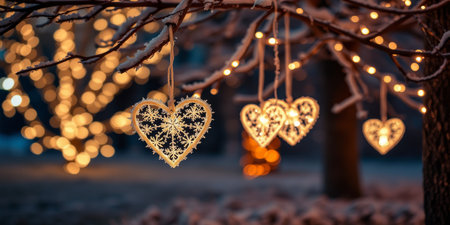 String of heart-shaped lights illuminate tree branches at dusk. Warm, romantic lighting creates a cozy atmosphere.