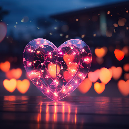 Heart-shaped lights blur beautifully in the night sky, evoking feelings of love and romance, ideal for special occasions and intimate celebrations