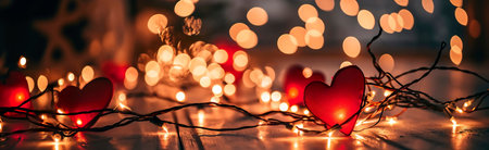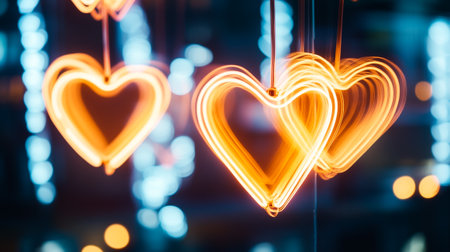 Two glowing hearts crafted from wire sit on a glittery surface, surrounded by soft bokeh lights. This image captures a romantic and festive atmosphere, perfect for celebrations.