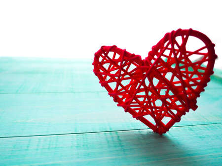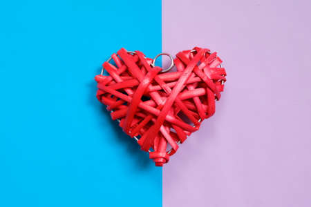Red wicker heart made of twigs on a blue background with place for text