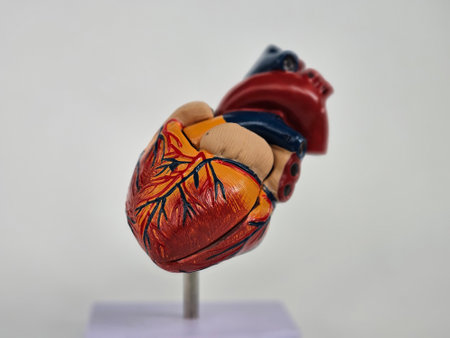 Colorful model of a human heart for educational purposes and anatomical study displayed in a studio setting