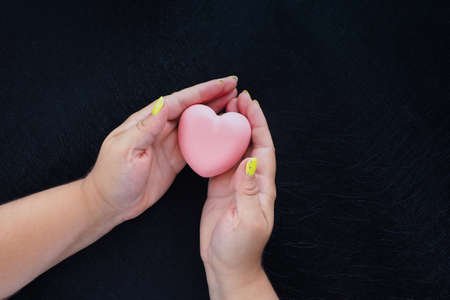 female hands holding a pink heart on a black background. copy space.