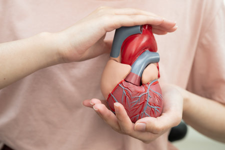 Heart model held in hand, showing detailed anatomy and blood vessels for educational purposes