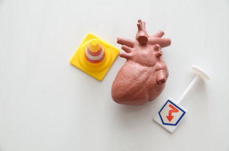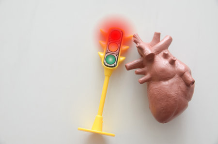 A powerful conceptual image of a miniature traffic signal with its red light glowing next to an anatomical human heart model, symbolizing critical cardiac risk and danger.