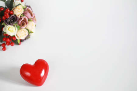 Bouquet of flowers on a white background and a figure in the shape of a heart