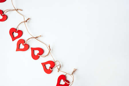 Valentines day decoration with ornaments in the form of hearts. White wooden background.