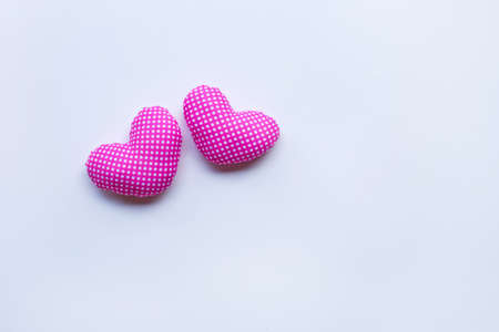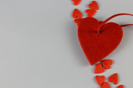 red textile small hearts on a white background, festive background, copy space