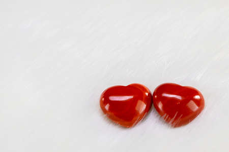 Two red wooden hearts symbol of love on white fur background, Saint Valentine Day celebration