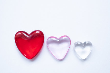 Red glass hearts on a white background. Valentine's day concept.
