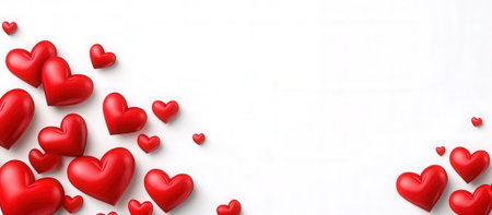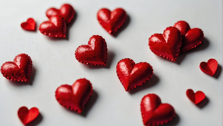 This image features a collection of vibrant red heart shapes scattered across a bright white surface. The scene evokes feelings of love, romance, and Valentines Day cheer.