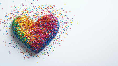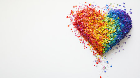 Heart made of rainbow confetti on a white backdrop, offering space on the right for text or additional elements.