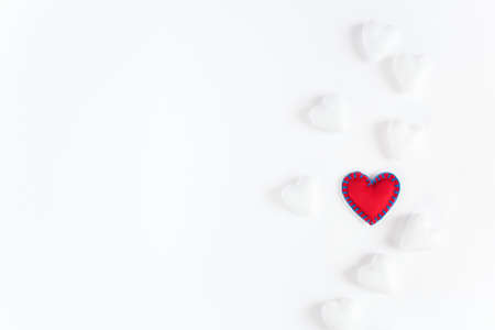 Hand made Red hearts on white background. Valentines Day flat lay.