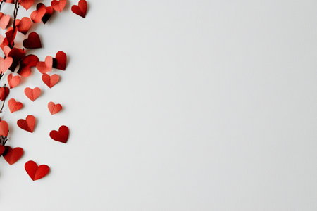 Small paper hearts in various shades of red scatter across a light surface, creating a festive and romantic atmosphere perfect for celebrations.