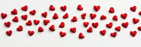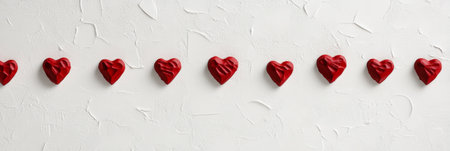 Small red hearts forming a horizontal line on a textured white background, creating a romantic atmosphere perfect for valentines day, mothers day, or spring celebrations