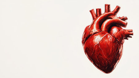 Anatomical illustration of the human heart, centered with clear copy space to the side, against a clean, white background.