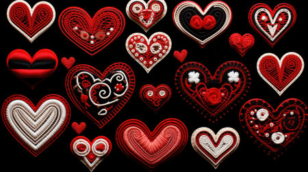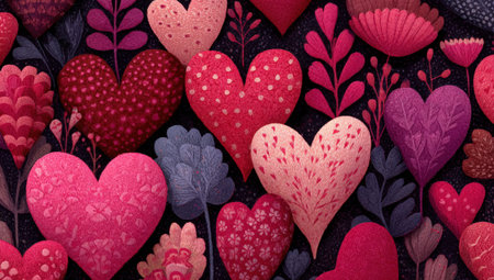 A vibrant pattern of red and pink hearts with distinct designs and floral elements on a dark background, perfect for romantic themes and celebrations