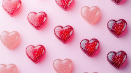 A delightful arrangement of colorful heart-shaped gummies on a pink background, perfect for celebrations and sweet treats. Ideal for love-themed occasions.