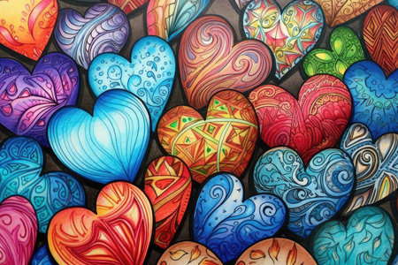 This vibrant artwork features a variety of heart shapes in a playful arrangement, perfect for projects focusing on love, creativity, or modern design themes.