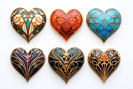 Colorful glass hearts on a white background. Valentine's Day. Set of decorative hert shapes, stained glass design - hearts on a white background, raster image