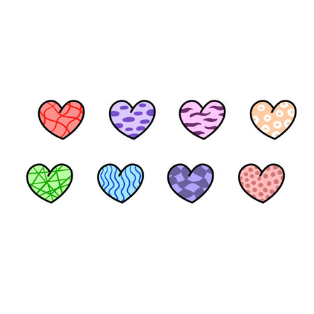 Set of color hearts with an unusual pattern, illustration. Collection of colorful hearts on white background, for design. Concept valentine's day, Love symbol.