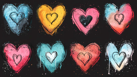 This vibrant image features a collection of hand-painted hearts in various colors and styles, set against a soft pink background, ideal for expressing love and creativity.