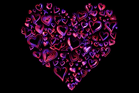 Dozens of neon hearts are forming giant glowing heart on black backdrop in digital illustration. Romantic, love, affection, vibrant, glowing, contemporary, artistic