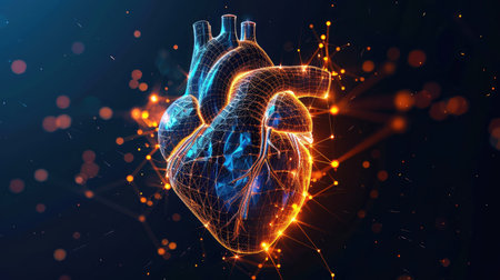 human heart with light grids symbolizing the complexity of cardiovascular health, nerve connections, impulses and nerve endings on a dark background