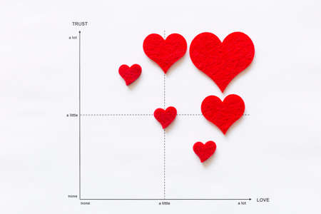 Concept of scientific analysis of love and affection. Line graph on white paper with red felt hearts and the elements trust and love